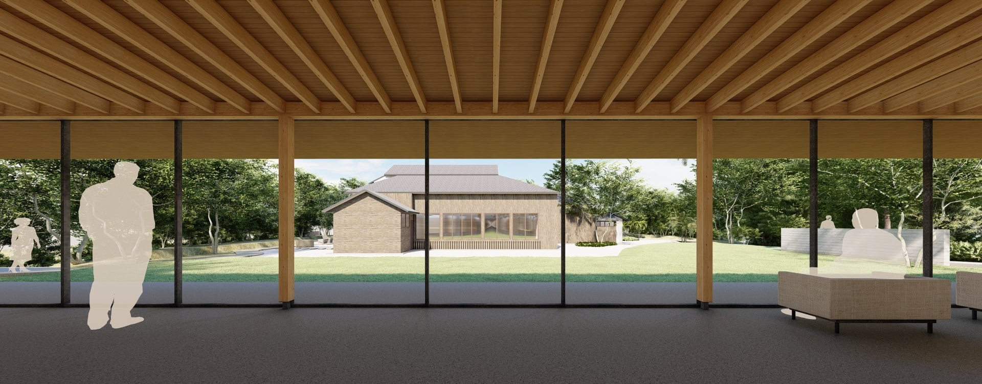 主屋と防風林という麓集落の屋敷の円環状の空間に、文化財を保存・鑑賞するためのランドスケープを加え、重層的な円環状のランドスケープを形成した。